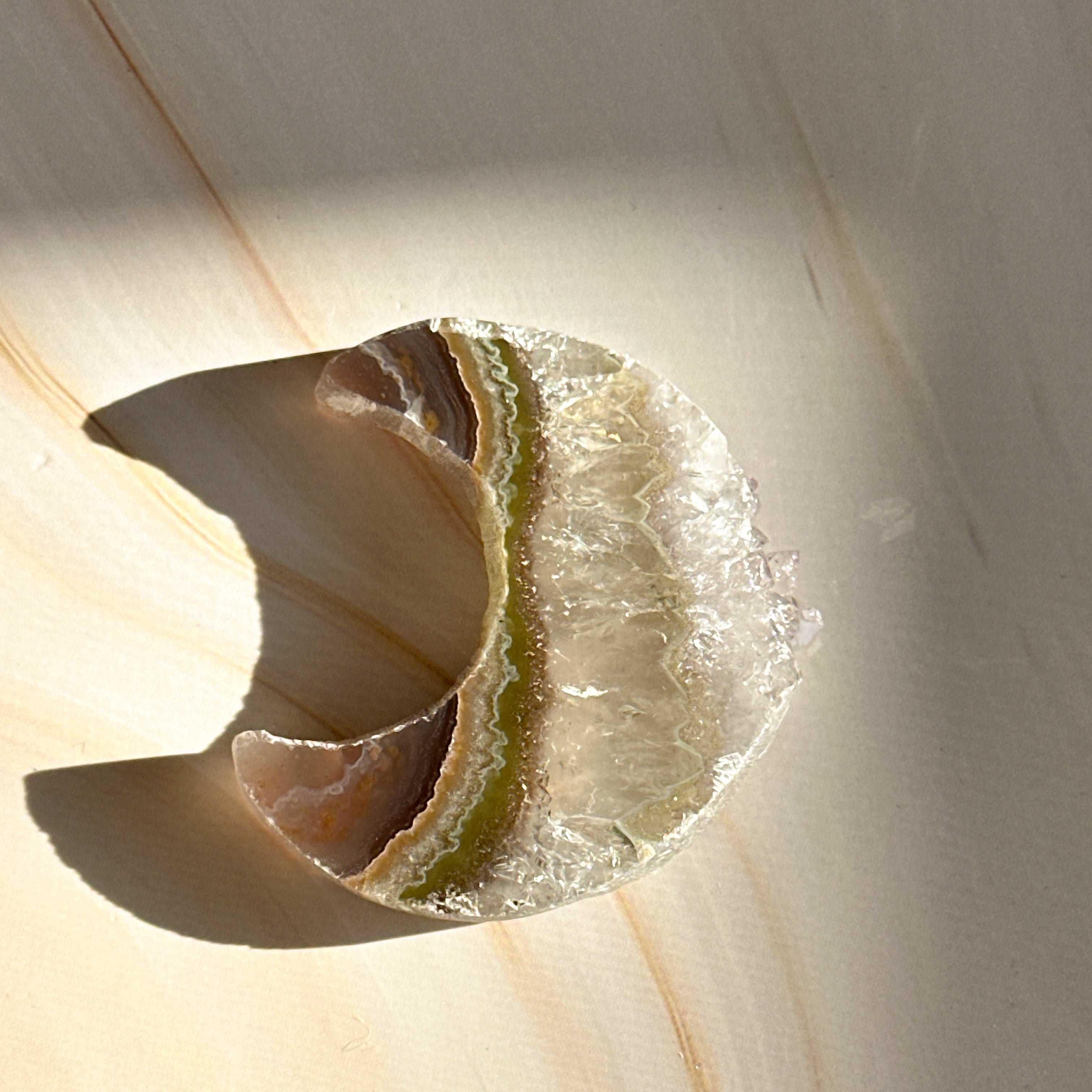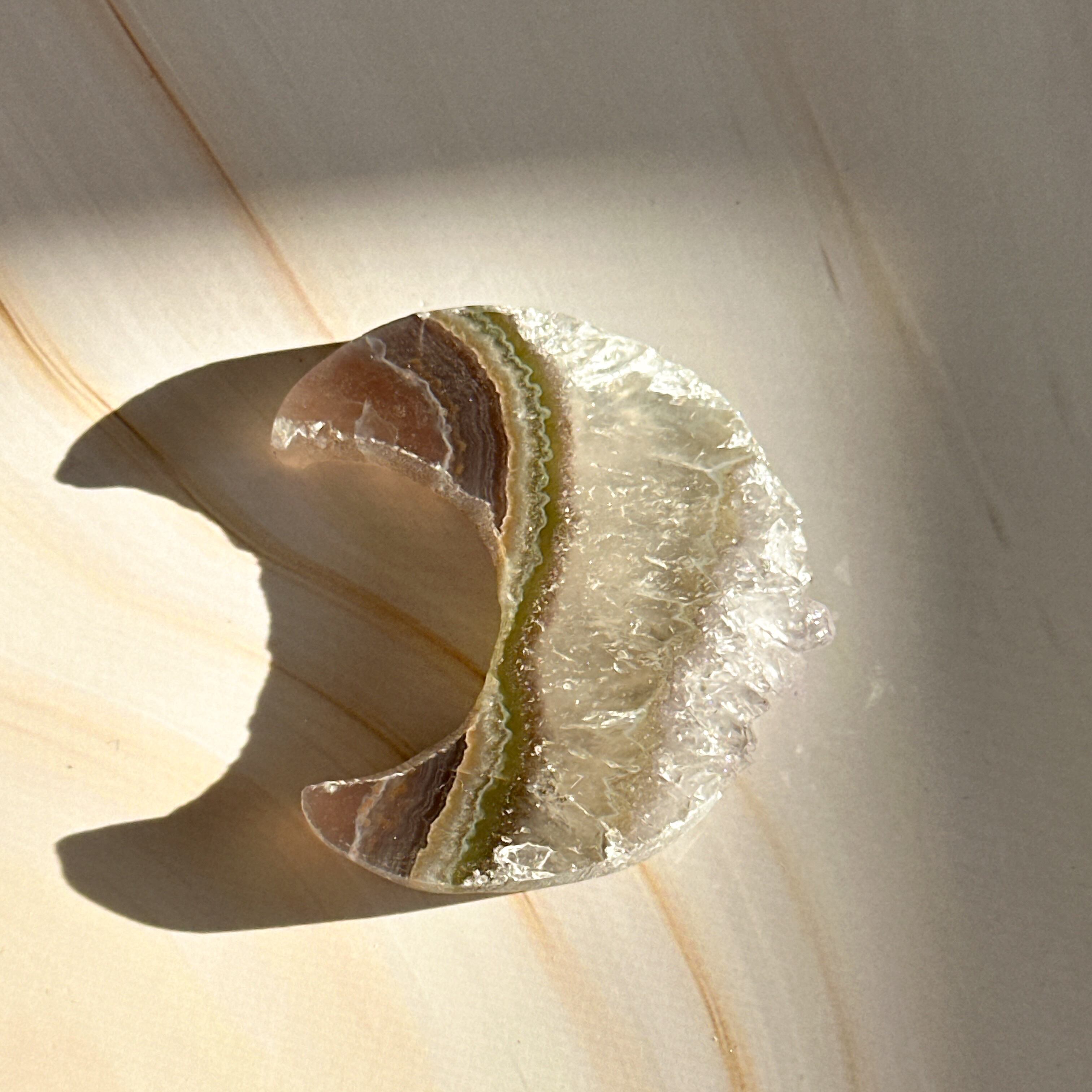 この月のアゲートとクリアクォーツのコラボレーションは、独特な模様と透明感が魅力の一品です。見る人を惹きつけるその美しさは、あなたの空間に洗練された雰囲気を与えます⁺‧₊˚